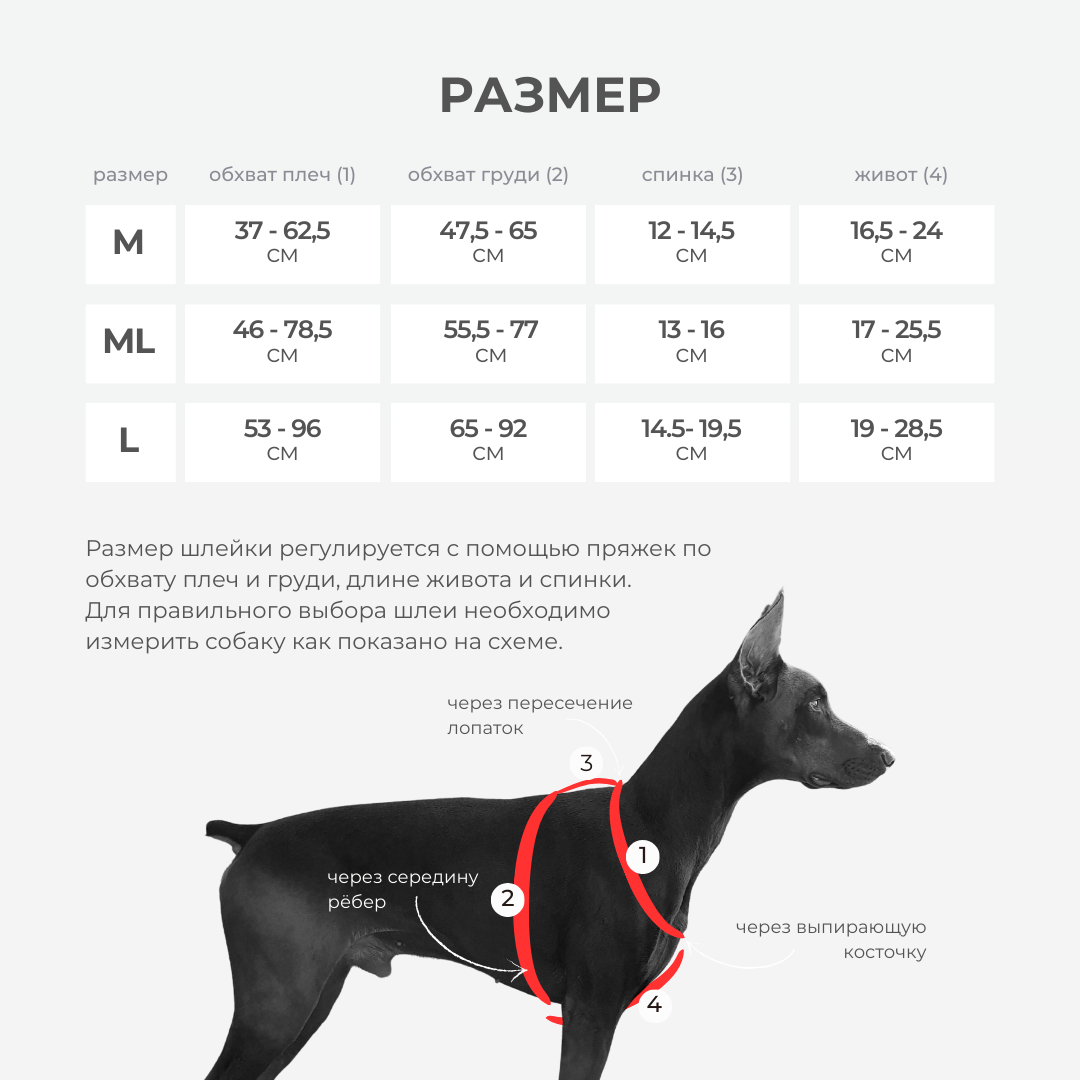 Анатомическая шлейка позволяет идеально отрегулировать амуницию на собаке. Имеет 6 точек регулировкиразмера: на спине, на животе, по одной на каждом плече, по одной с каждой стороны на груди.